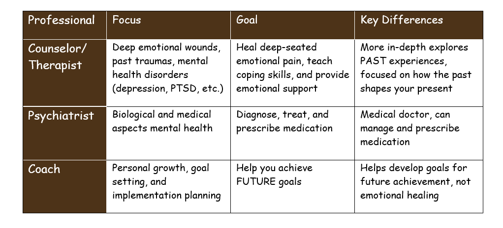 Please note: I am not a therapist or medical professional. Coaching with me is future-oriented, not diagnostic or prescriptive. If you're in need of clinical mental health support, I can help refer you to the appropriate type of provider.